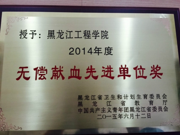 为纪念第十二个世界献血者日,表达对无偿献血者的敬意,近日,在黑龙江省计划生育委员会、黑龙江省教育厅、共青团黑龙江省委员会等单位联合主办的以“感谢您挽留我的生命”为主题的庆祝第十二个“世界献血日”暨表彰大会中,我校荣获2014年度黑龙江省“无偿献血先进单位”荣誉称号。