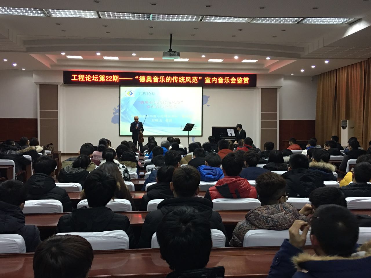 12月7日晚,由黑龙江省音乐家协会,hth体育-(中国)科技公司团委、科研处,哈尔滨师范大学音乐学院联合举办的第22期“工程论坛”在我校科技交流培训中心四楼会议室隆重举行,荷兰籍著名华裔小提琴演奏家郑锦龙先生、青年钢琴演奏家张扬先生做客我校“工程论坛”,带来题为“德奥音乐的传统风范”的室内音乐会鉴赏,为我校热爱音乐的师生带来了一场视听盛宴。哈尔滨师范大学音乐学院的领导亲临现场,和我校近200名爱好音乐的同学一同欣赏了这场高雅的音乐盛宴。