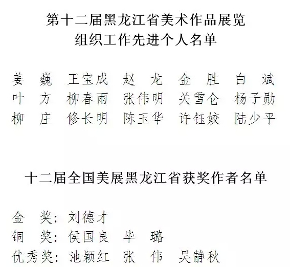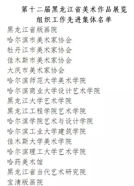 艺术学院获第十二届黑龙江省美术作品展组织工作先进集体称号,艺术学院教师白斌获第十二届黑龙江省美术作品展组织工作先进个人称号。
